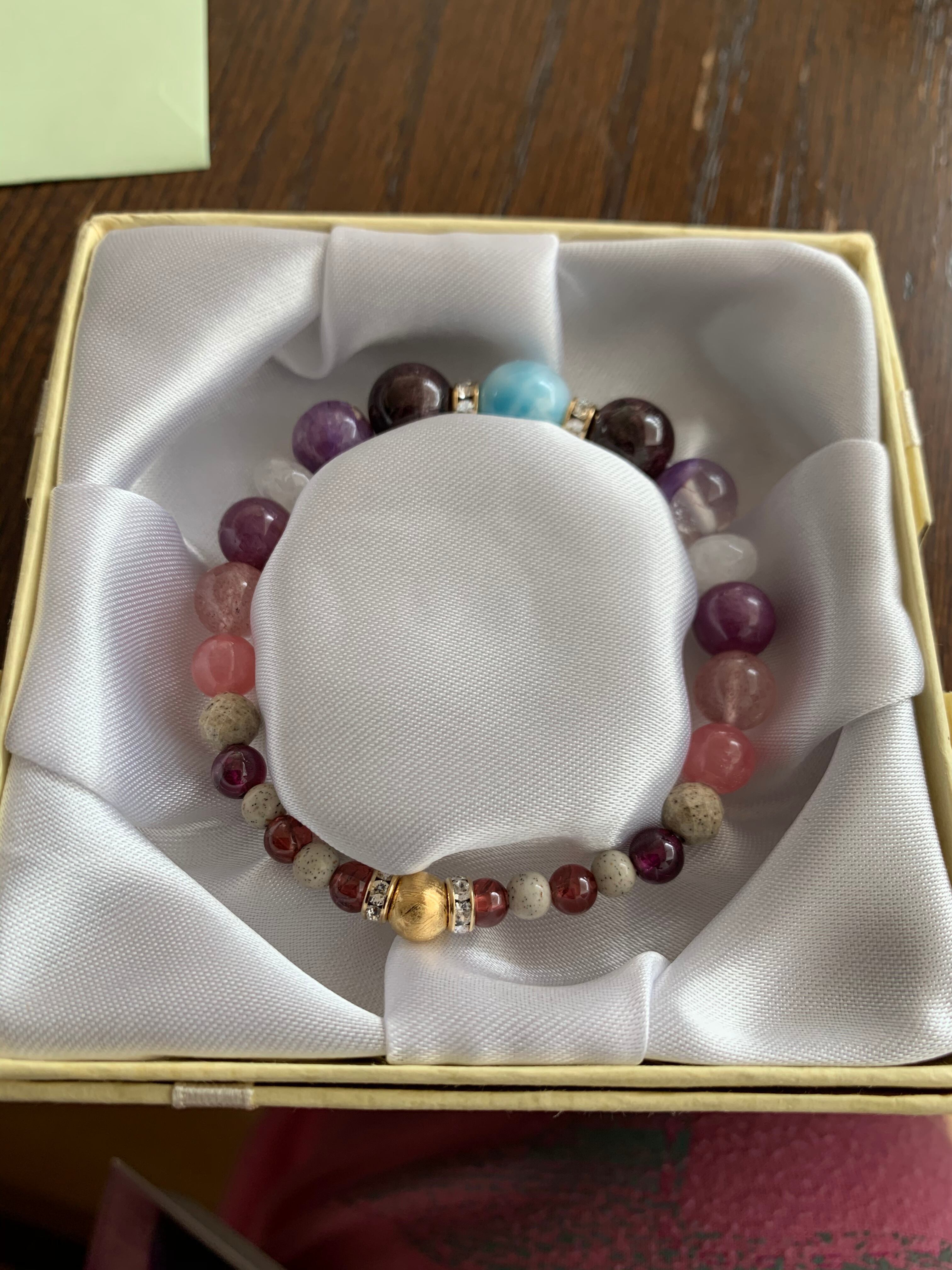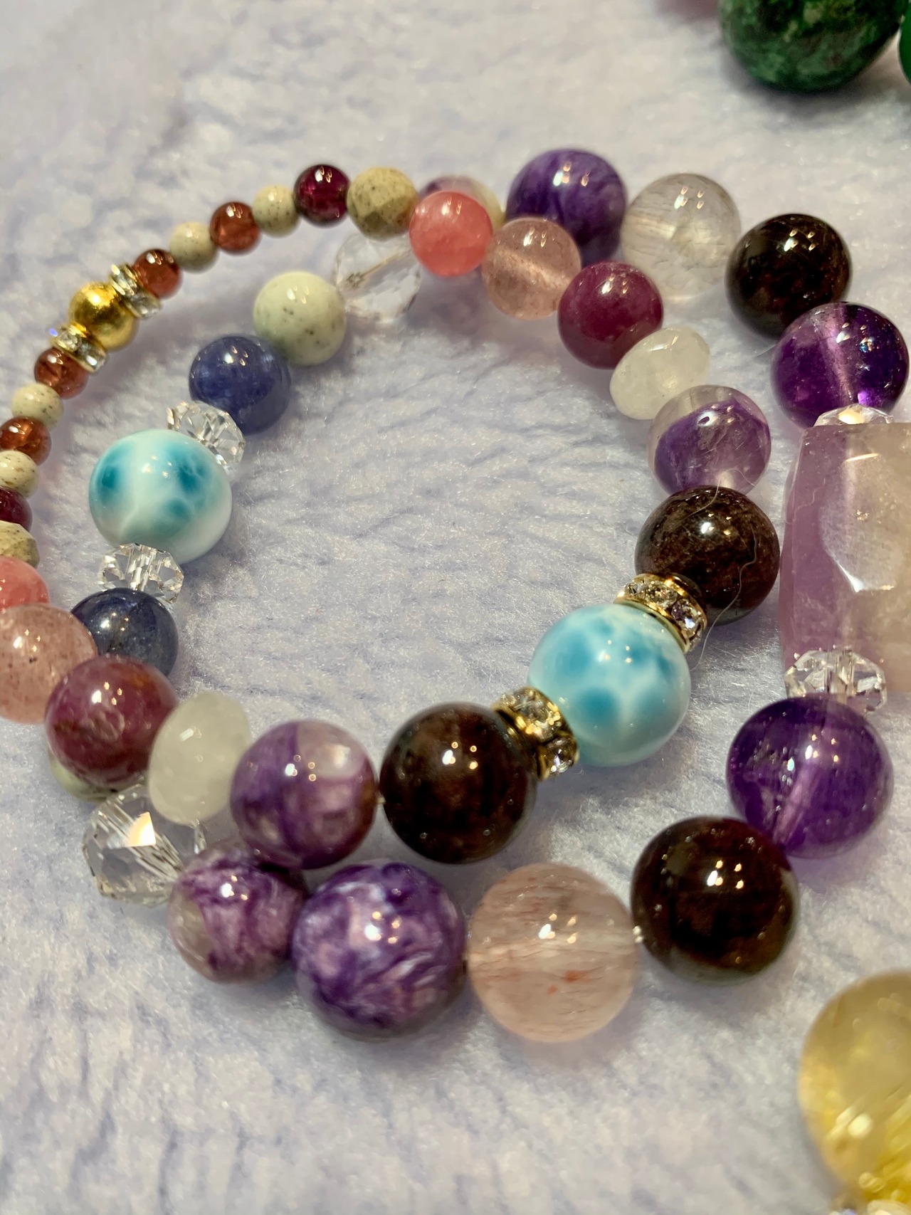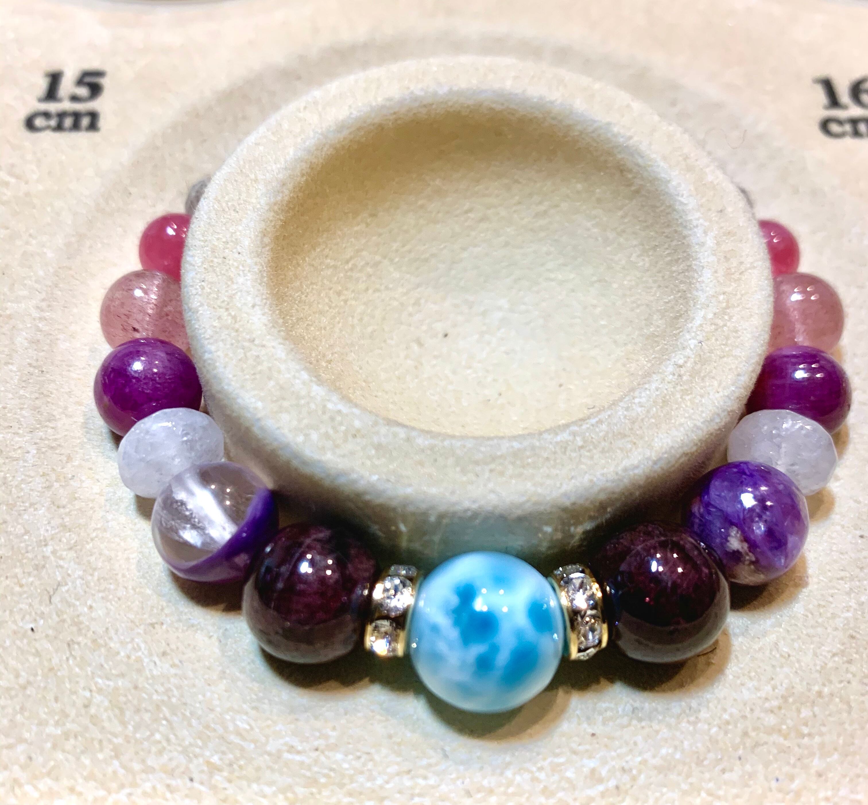 世界三大癒しの石とされるラリマー、チャロアイト、スギライトを全て入れた、安眠間違いなし、癒しのブレスレットです。二つパターンがあります。両方にラジウム温泉と同じ効果がある北投石も使用していますが、ギベオン隕石が入っている方が10000円です