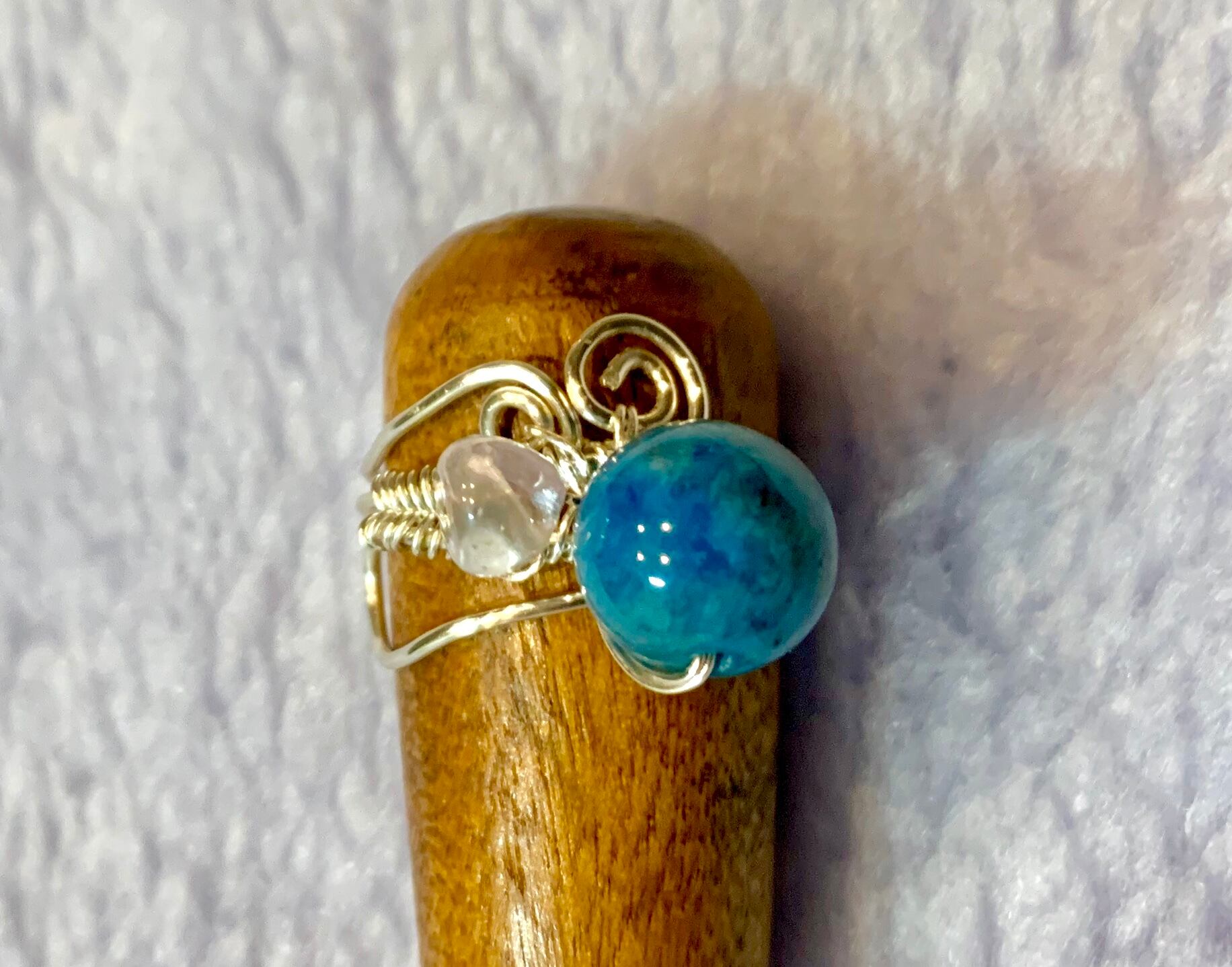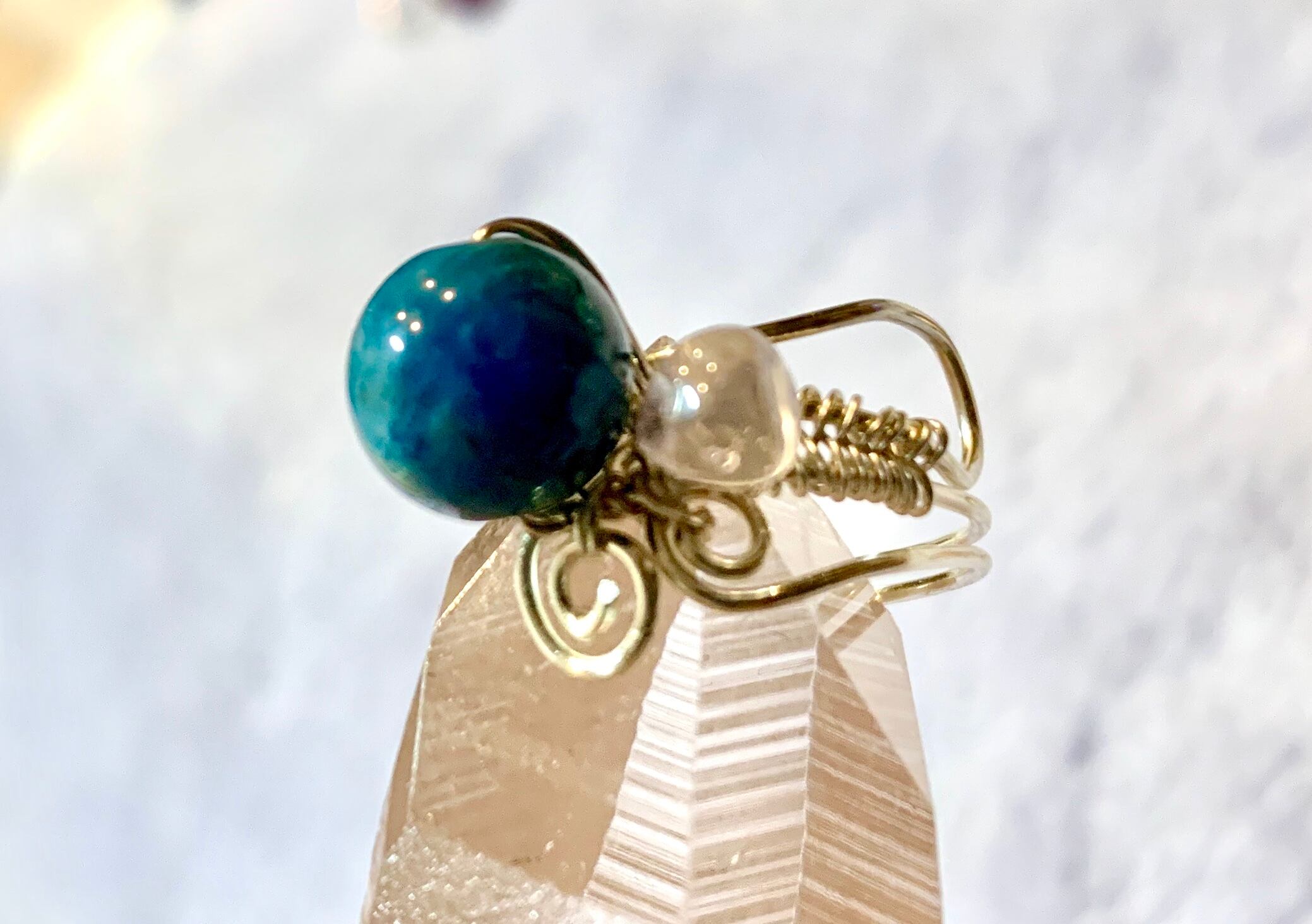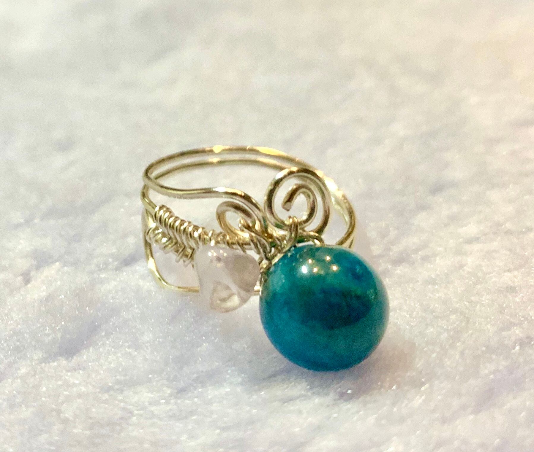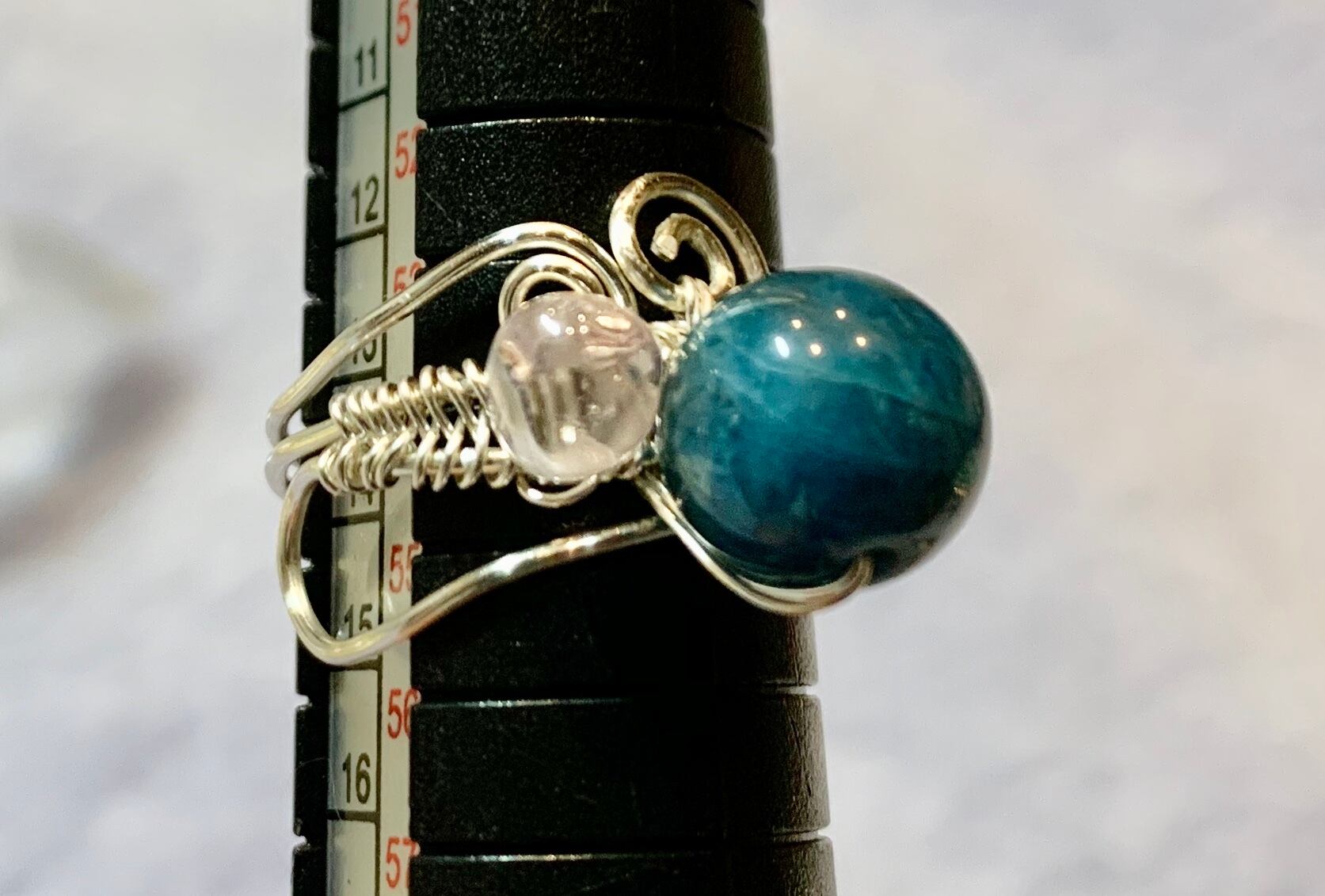 不要なものを手放し新しいことに挑戦するパワーを与えてくれるブルーアパタイト。それと癒した調和のアメトリンを組み合わせました。このタイプは多少調整が効いて、12ー14号が最適です。