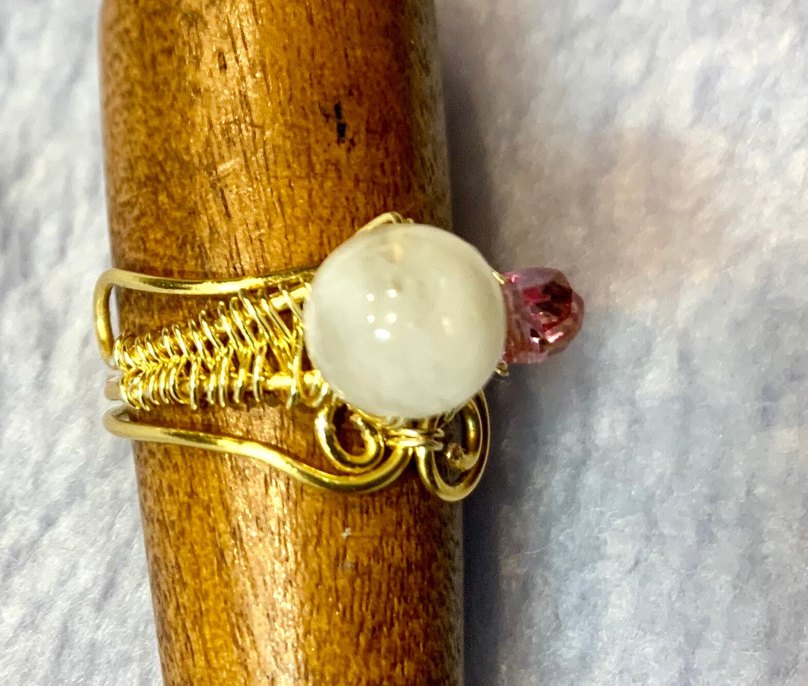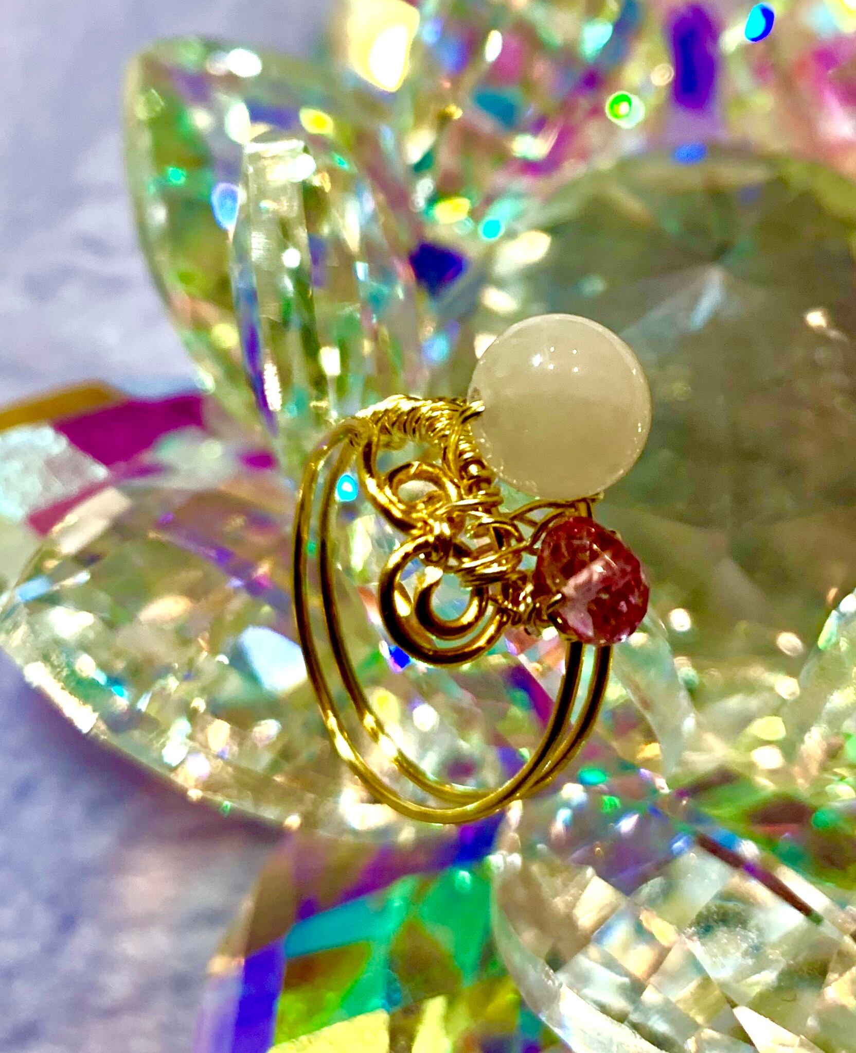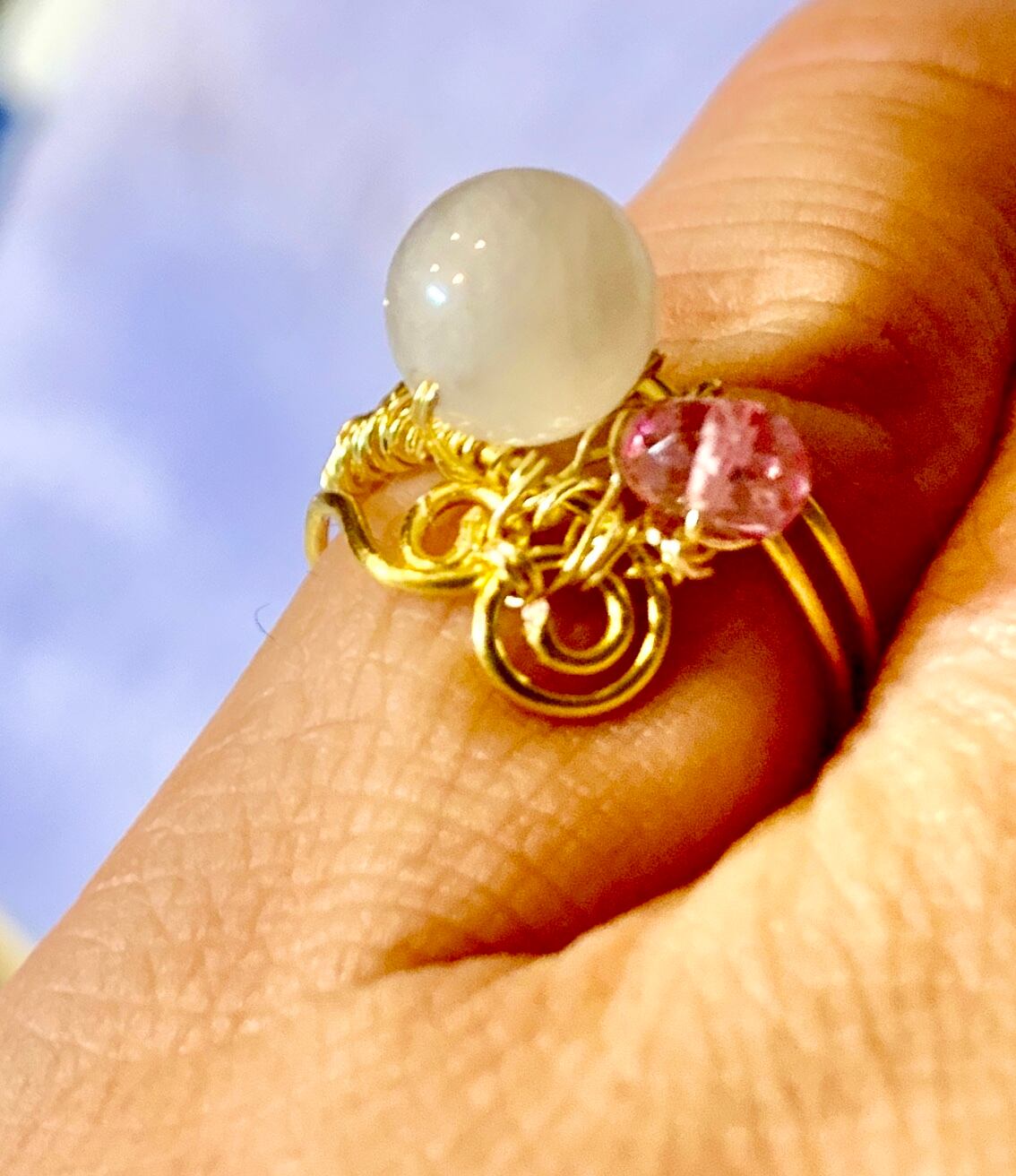 ムーンストーンとピンクトパーズを使った金色のリングです。愛する人を引き寄せる、異性に限らず愛情をいっぱい受けられる、そんな優しいイメージのムーンストーン ですが、案外強い石で悪い影響を受けにくく、安定した癒しの波動を出してくれるそうです。おおらかな印象のムーンストーンの隣にはめちゃくちゃ愛らしいピンクトパーズをつけました。こちらも恋愛の石として有名ですが、怒りや嫉妬などネガティヴな感情を抑え、創造力や知性を高めてくれる賢い石でもあります。ピンクと白と金色でとても可愛いですよ。13ー15号対応です。かなり小さいサイズをご希望の場合、メッセージください。すぐに作れるかどうかはわかりませんが、出来る限り対応します。