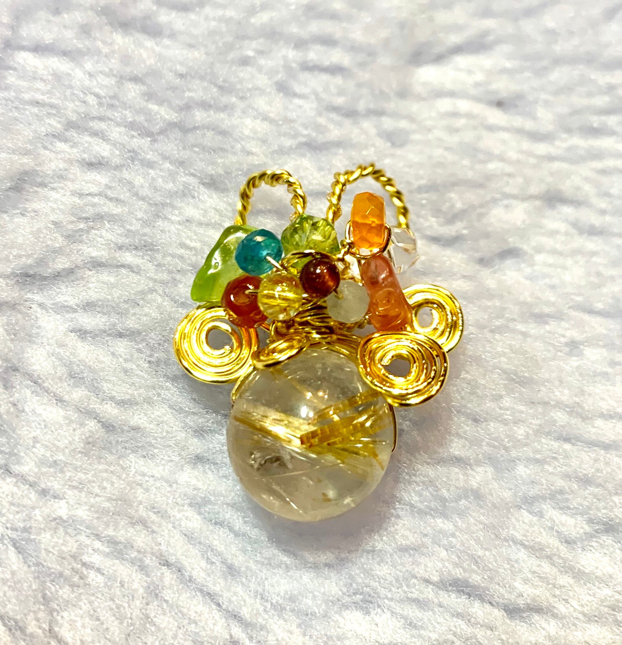 メインの石はルチルクォーツ。はっきりと針が見えます。金が入っている=お金が入ってくるということで不動の人気がありますが、どうやって、こんなふうに自然で金の針ができたのかな?とみているだけで気の遠くなるようなときの流れが作り出した造形美をの世界に入って嫌なこと忘れます?笑