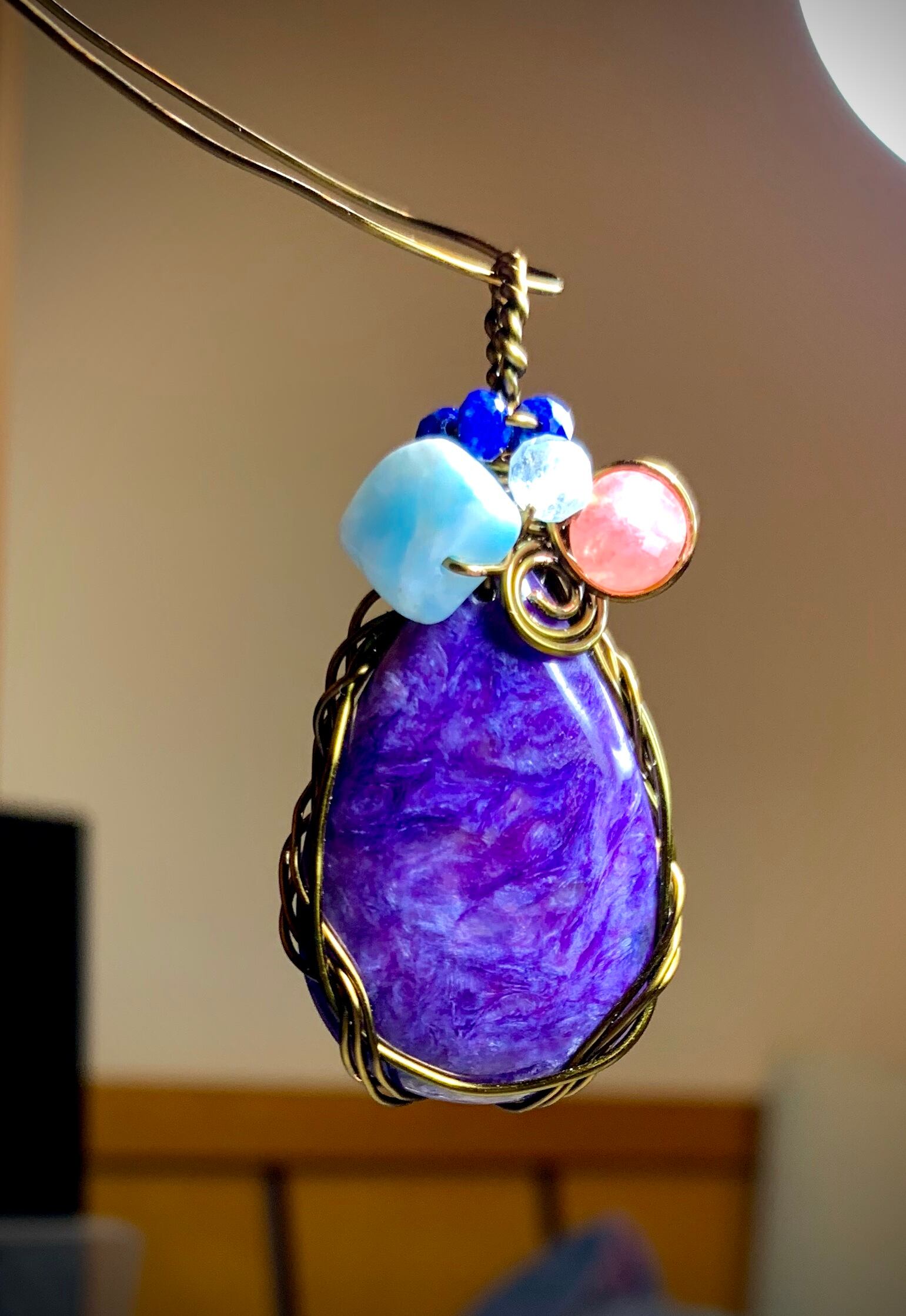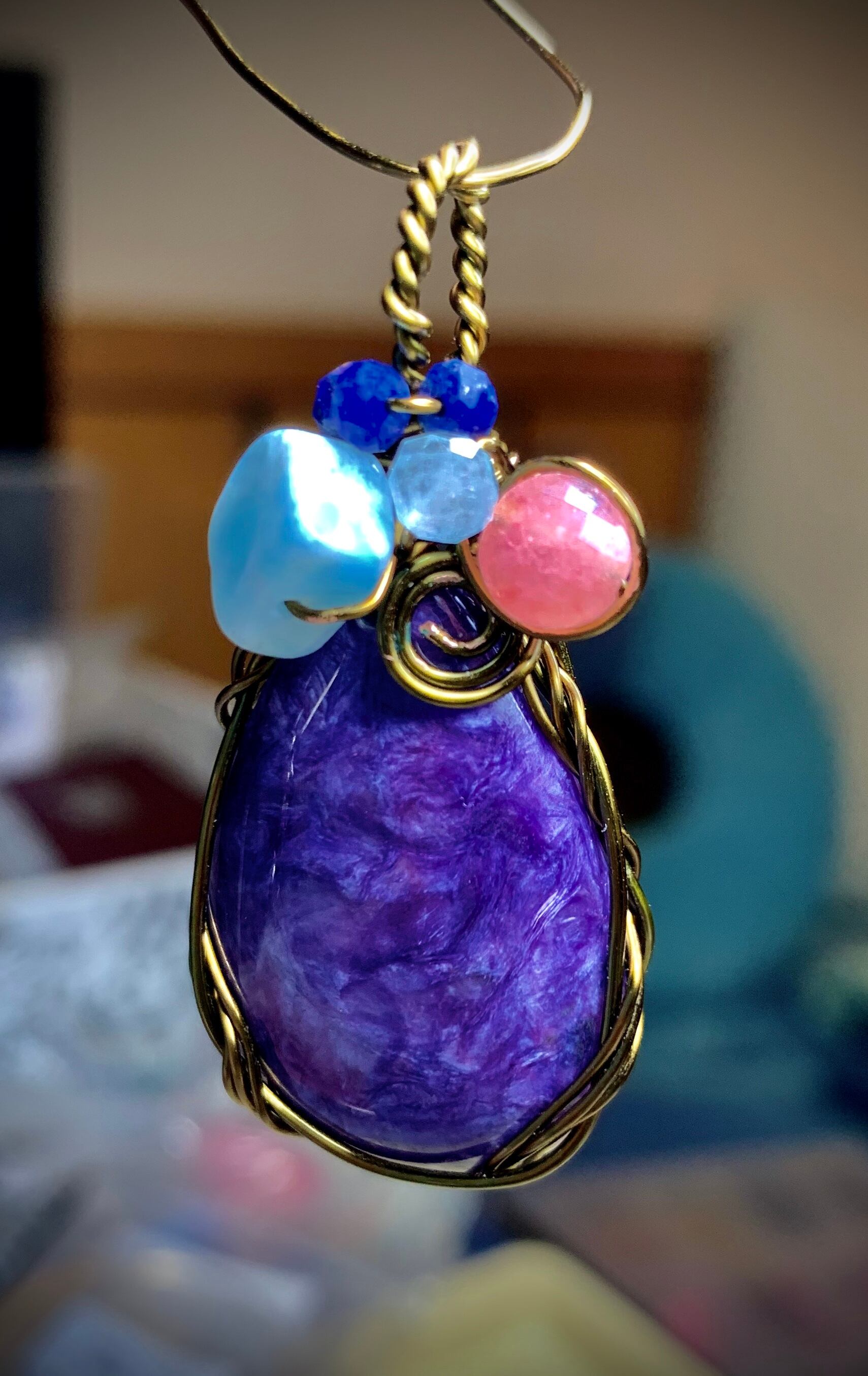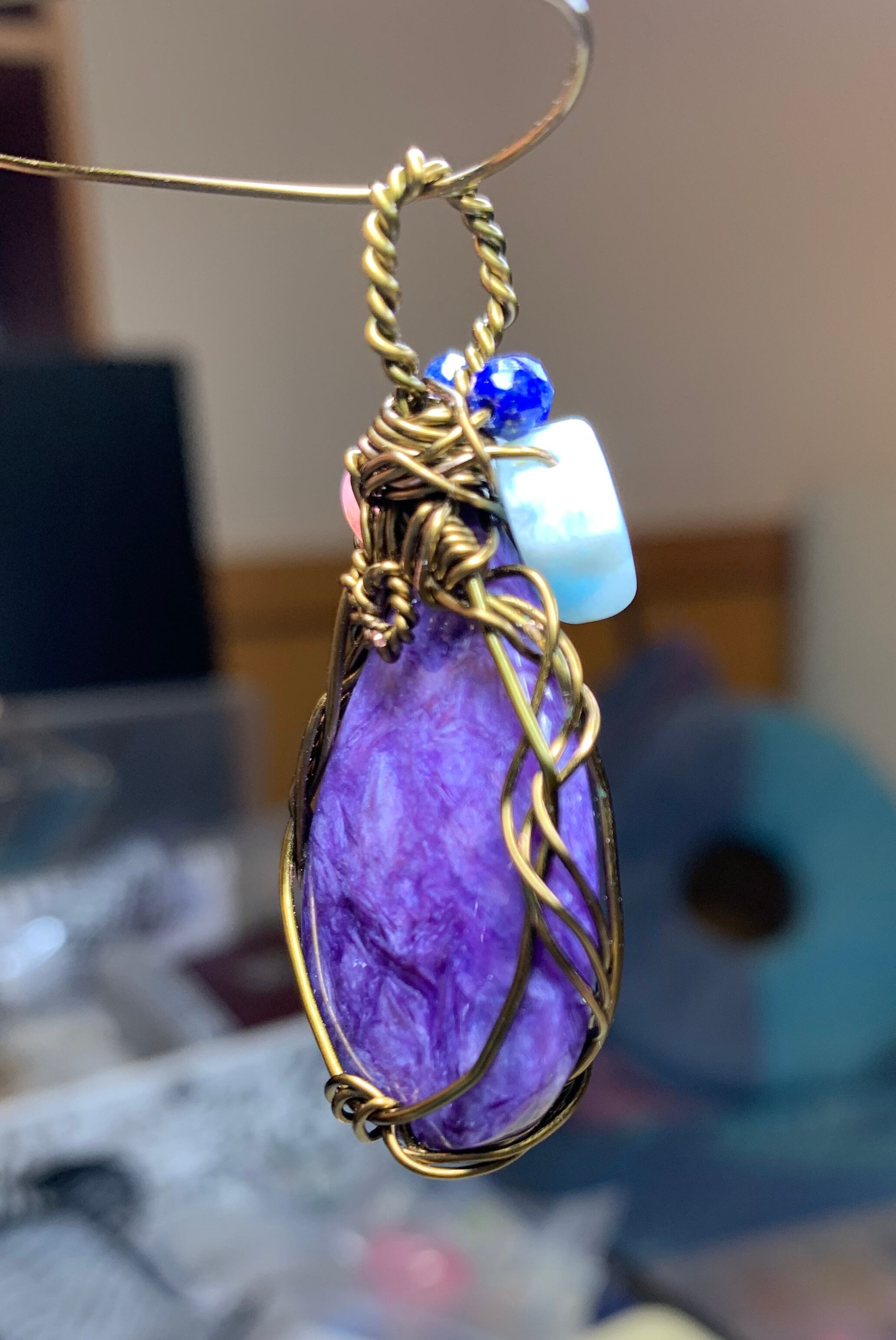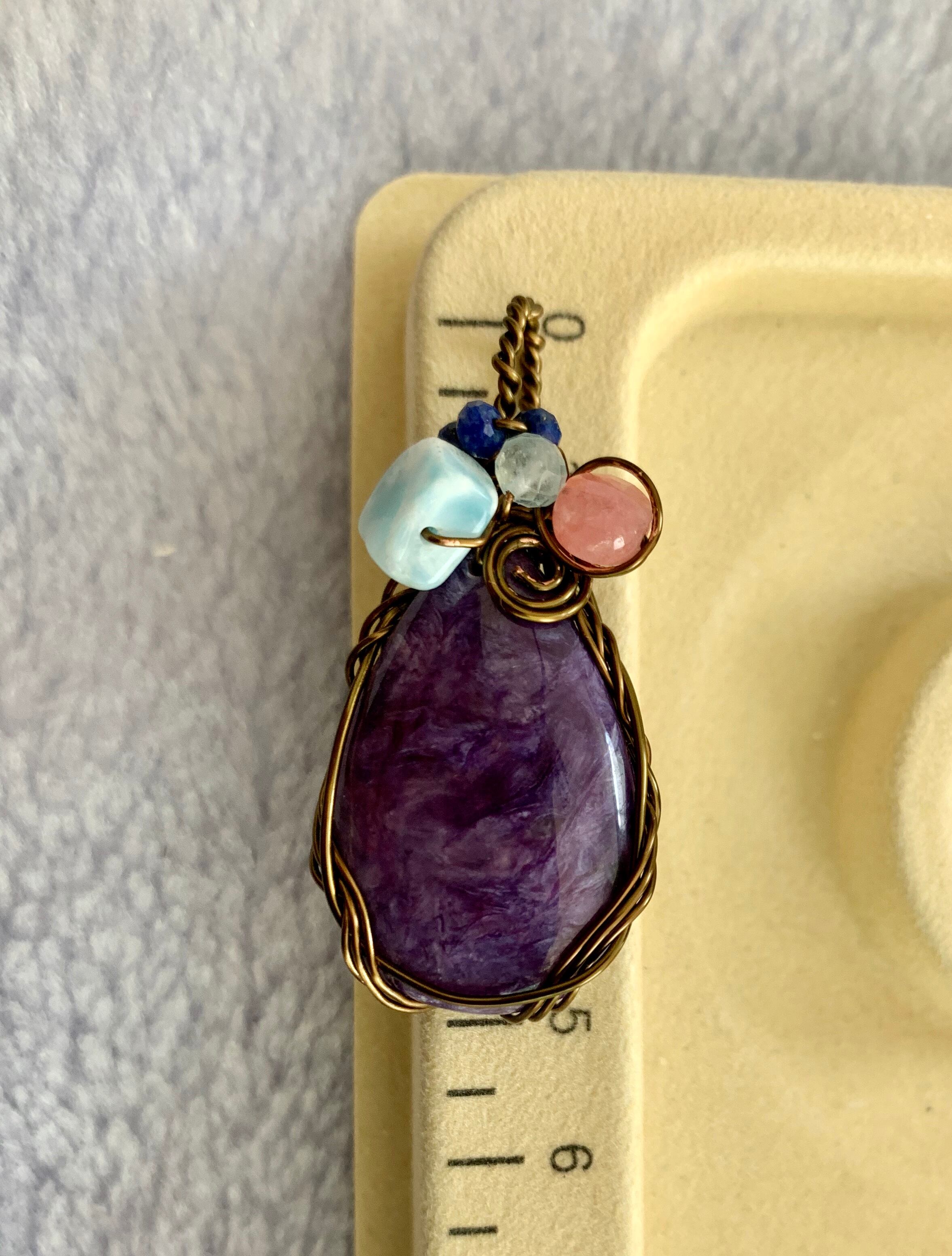 このチャロアイトは優しくそばにいてくれそうです。たとえ私の細工が古くなっても、取り去ってまた、新しいアクセサリーがお守りとして大事にして欲しい石です。